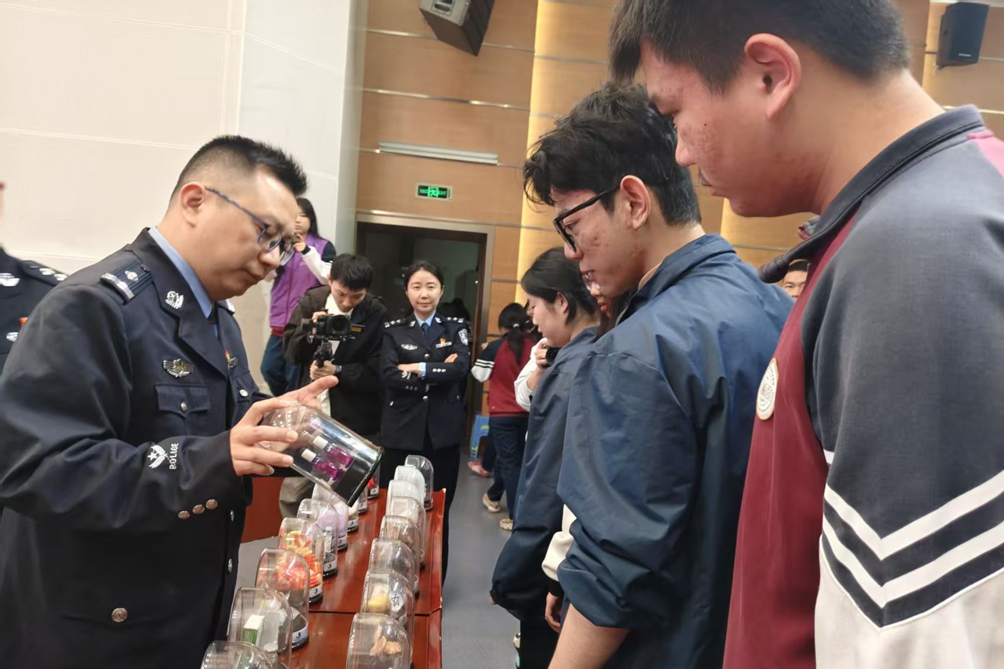 讲座结束后,同学们观摩了仿真毒品模型。仿真毒品模型直观还原了各类毒品的外观形态,尤其是伪装成零食、饮料、邮票的新型毒品模型让同学们有了更深了解。民警在现场逐一讲解,解答同学们的疑问,帮助大家消除认知误区,提升辨别能力。