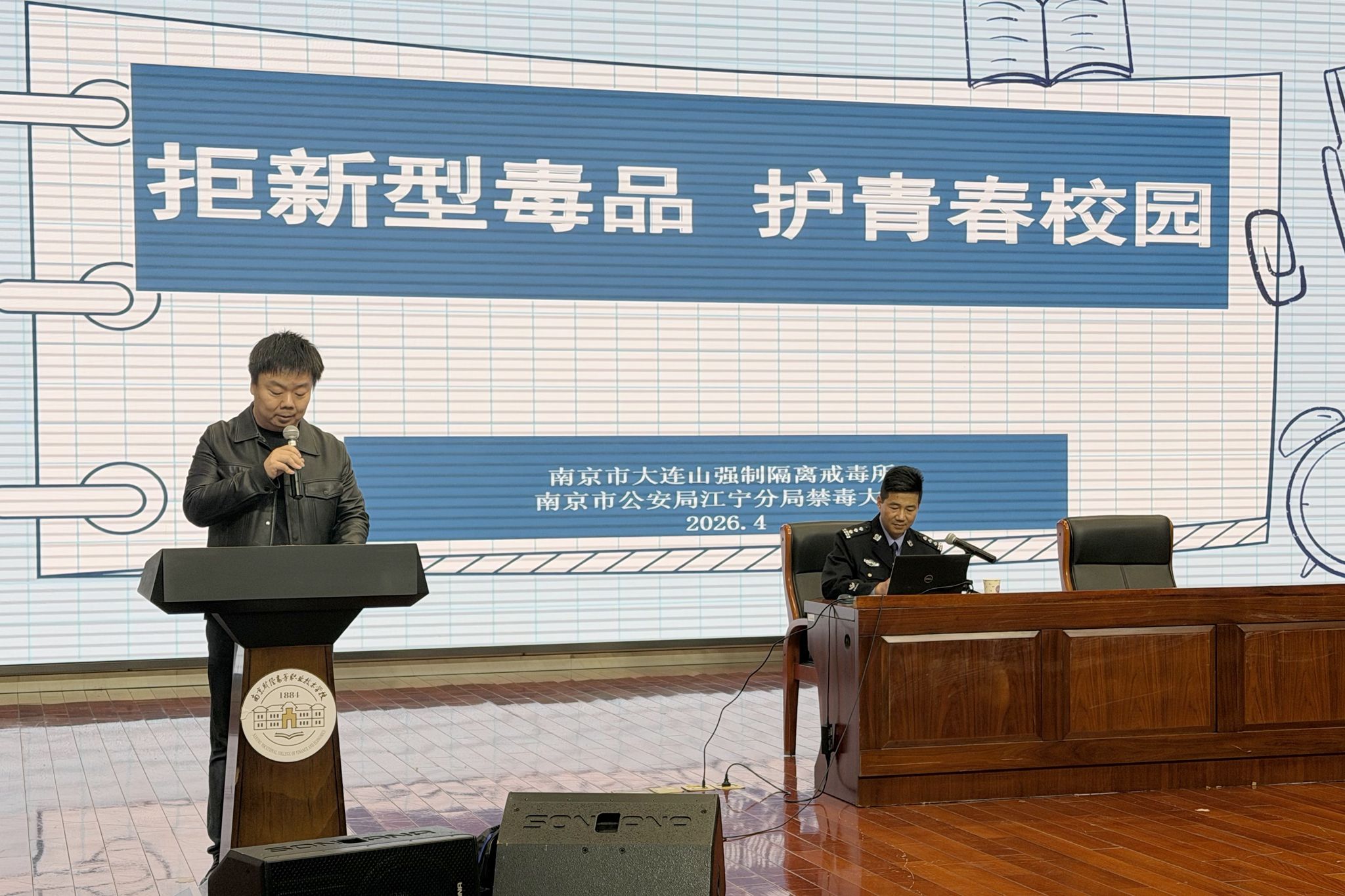 为进一步筑牢青年学生识毒、防毒和拒毒的思想防线,增强防毒意识,提升拒毒能力,营造“健康人生、绿色无毒”的校园氛围,4月15日下午,南京市大连山强制隔离戒毒所六大队大队长张杨强、南京市公安局江宁分局禁毒大队教导员魏拓、内保大队教导员袁慧玲、湖熟派出所副所长杨常泉等一行走进校园,带来了一场专业的禁毒知识专题讲座。讲座由学生工作部主任王祥主持。