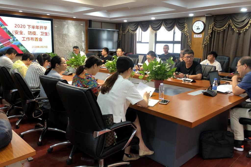 为全力做好学校新型冠状病毒感染的肺炎疫情防控工作,保障广大师生员工生命安全和身体健康,维护学校正常教学秩序和安全稳定,8月28号,我校在夫子庙校区召开2020下半年开学(安全、防疫、卫生)工作布置会,学生工作部、后勤工作部、安全工作部等部门人员参会。李明庚副校长、姜峰副校长出席会议。