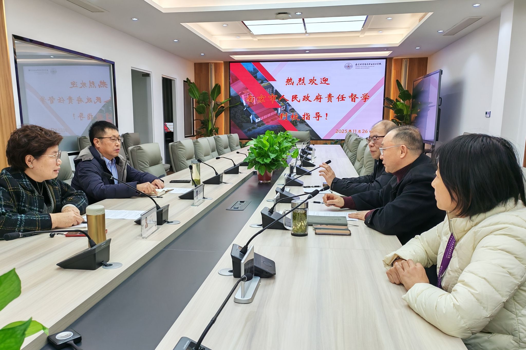 姜峰副校长首先代表学校对督学组的到来表示热烈欢迎,并对市教育局长期以来给予的关心与支持致以衷心感谢。随后,安全工作部主任朱春健就校园安全相关工作进行了专题汇报:在“一键报警”系统运行方面,学校已在各校区门卫室全面安装“一键报警”装置,并委托专业维保单位定期开展设备检查与功能测试,确保系统始终保持良好运行状态。同时,学校将“一键报警”装置的正确使用纳入防入侵、防恐应急演练培训内容,有效提升相关人员的操作熟练度,切实增强校园突发事件的快速响应与联动处置能力,为师生的安全保驾护航。在消防安全管理方面,学校构建了“人人有责、层层负责、各负其责”的全员安全责任体系,将责任细化到岗、落实到人,确保安全工作岗岗有人管、事事有人抓。强化协同治理,结合第三方专业检查、校园风险评估、消防安全标准化建设及校园安全“大起底”专项行动,系统排查消防安全隐患,建立问题清单并限期整改。学校还通过系统化、常态化的安全教育,切实增强师生“预防在前、教育先行”的安全意识,全面提升校园安全管理水平和师生自我防范能力。此外,学校建立了安全工作考核机制,将考核结果与教职工绩效挂钩,并在每学期系部考核中设置安全专项指标。2022年江宁校区、2023年夫子庙校区先后被南京市教育局和南京市消防救援支队评为“南京市学校消防安全标准化管理单位”。